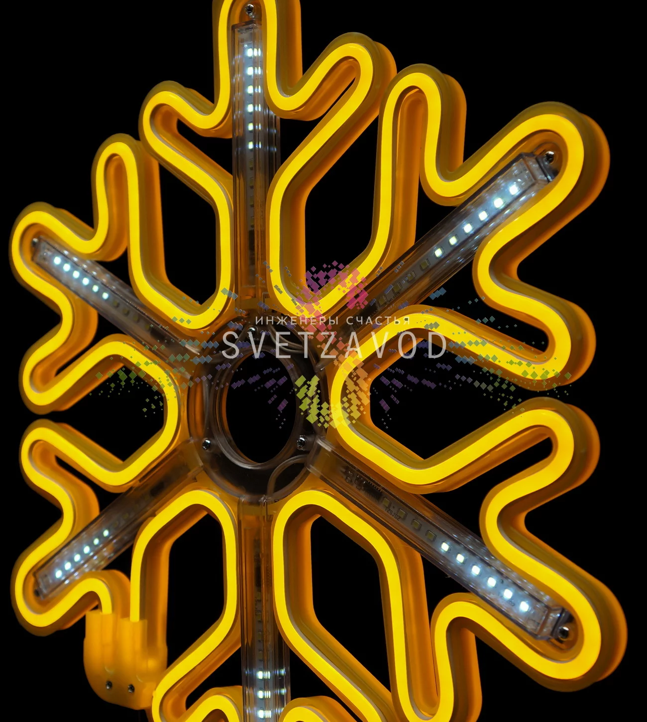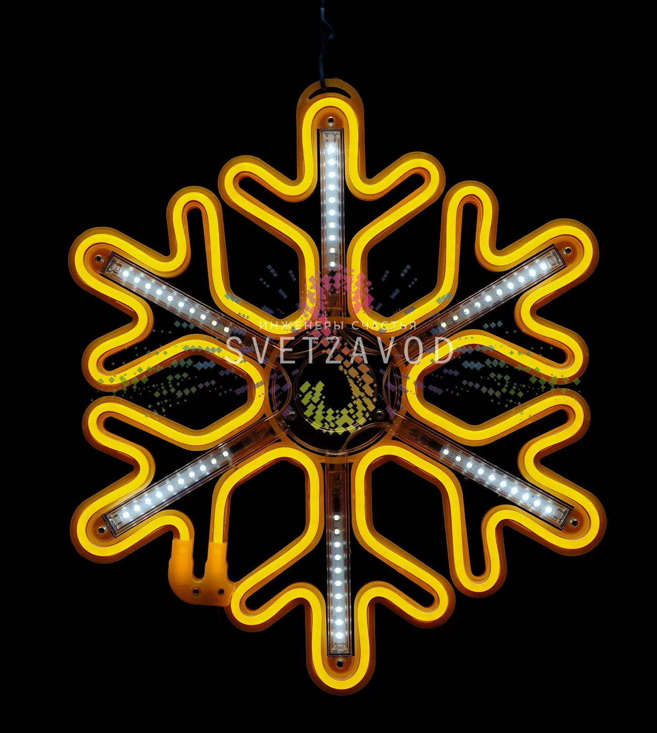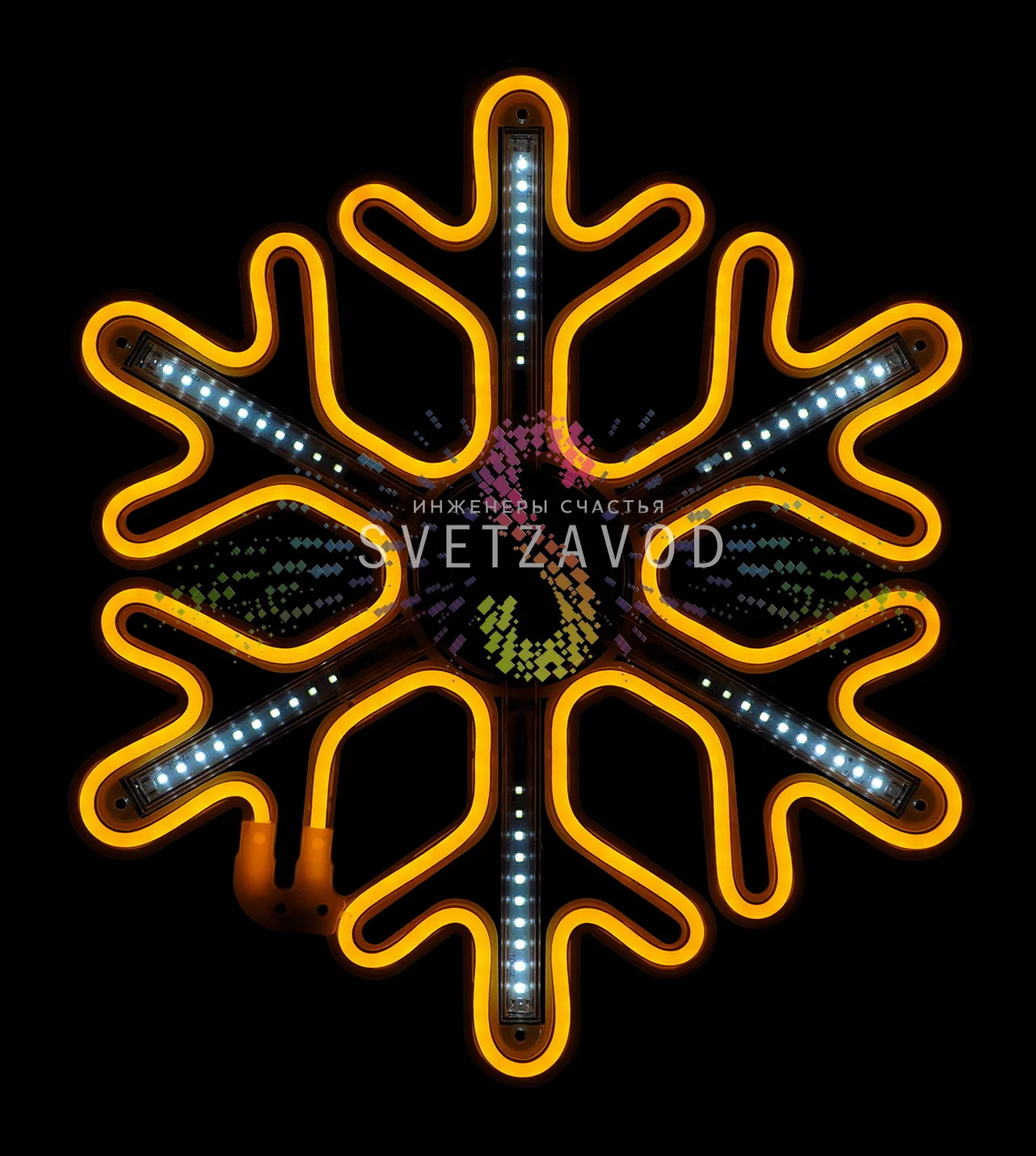 Устройство: Каркас снежинки изготовлен из прочного пластика, который сохраняет форму при перепадах температур и механических воздействиях. Внутри по контуру проложен гибкий светодиодный шнур (дюралайт) в силиконовой оболочке, которая и обеспечивает высокую степень защиты IP65 от пыли и струй воды.