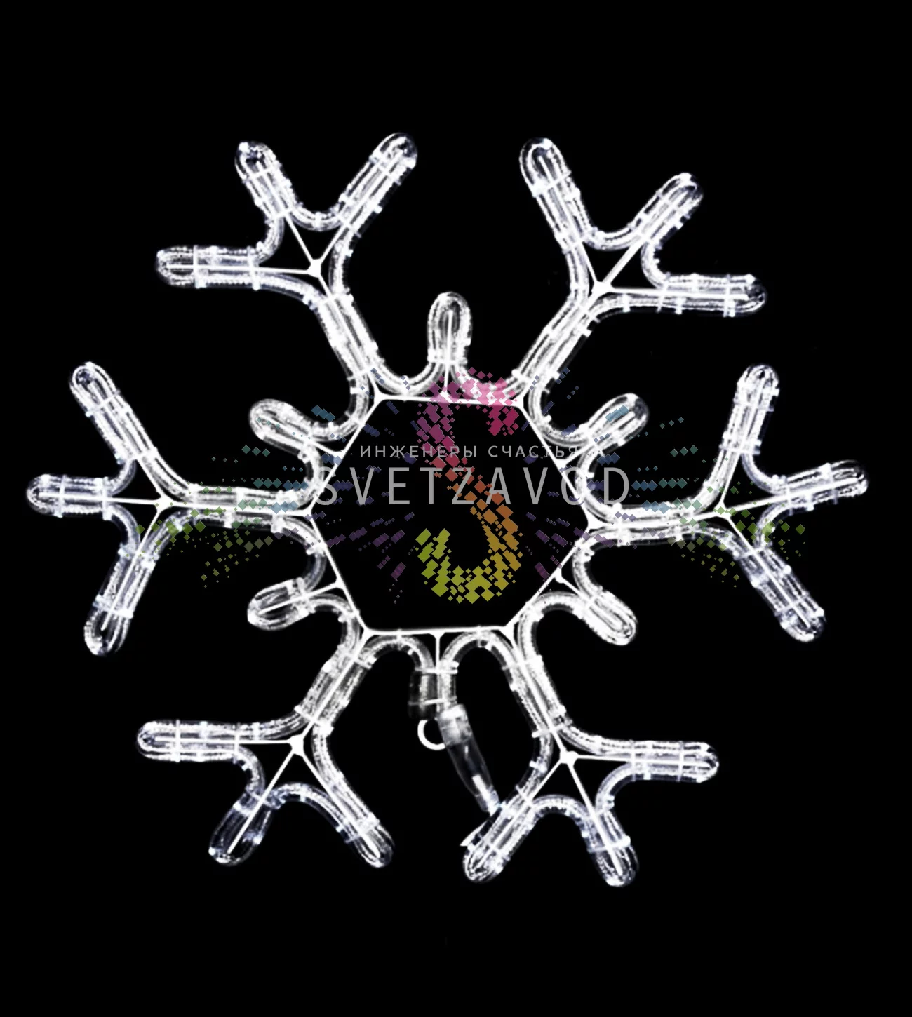 Основа долговечности: Каркас снежинки изготовлен из металла с порошковым покрытием. Это обеспечивает жесткость формы и защиту от коррозии. Светодиодный дюралайт (144 диода) надежно закреплен на каркасе и рассчитан на 40 000 часов работы.