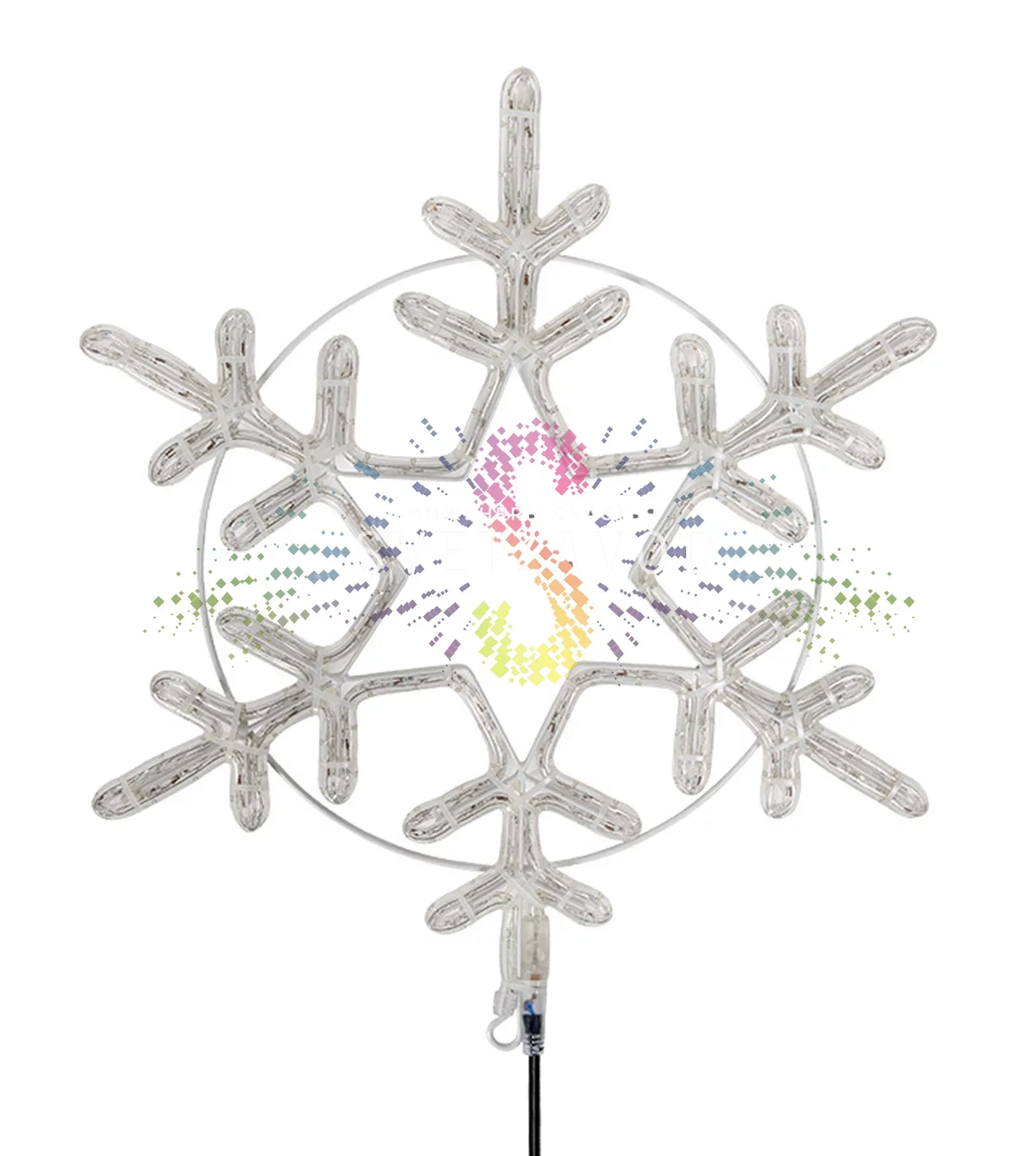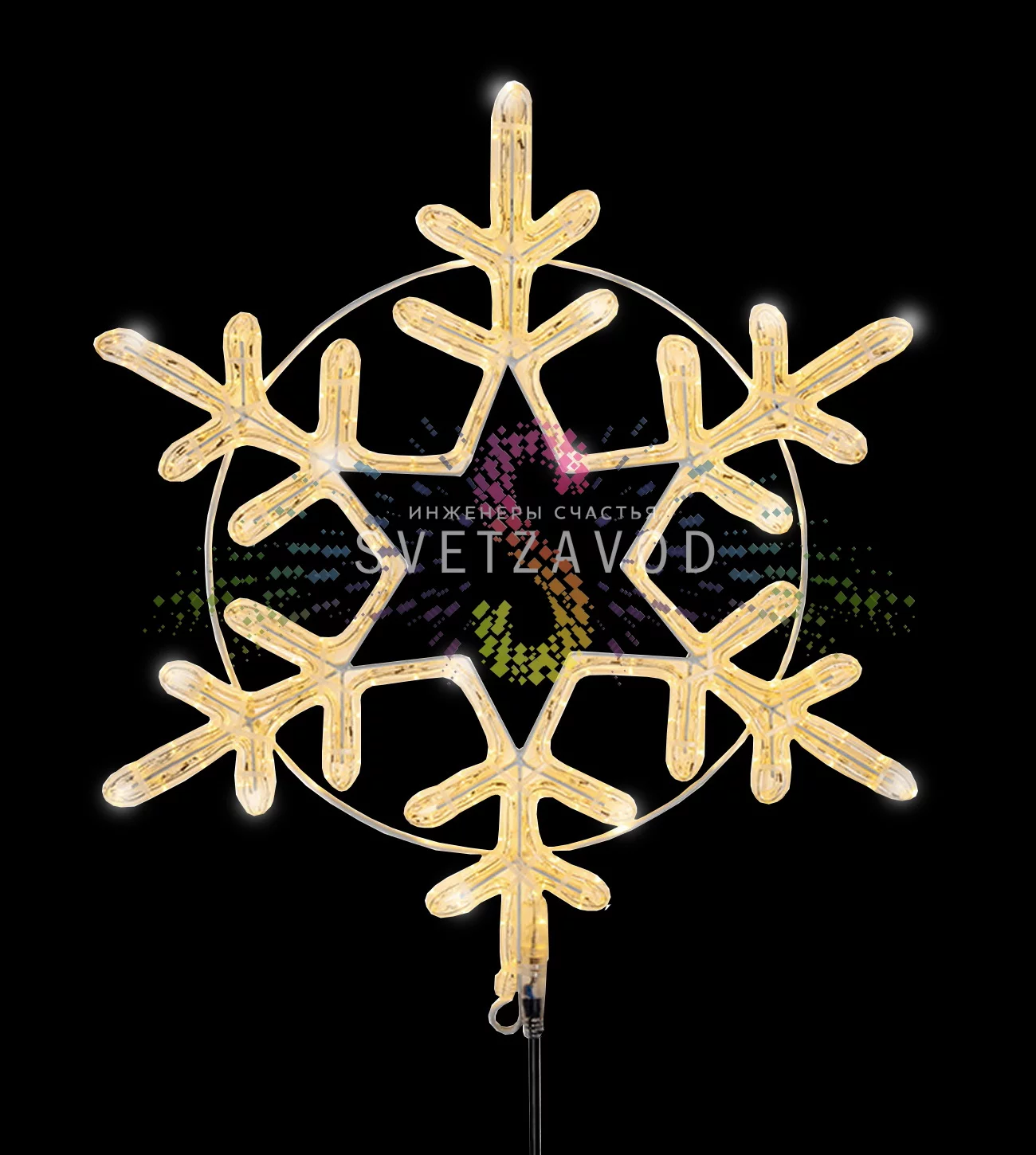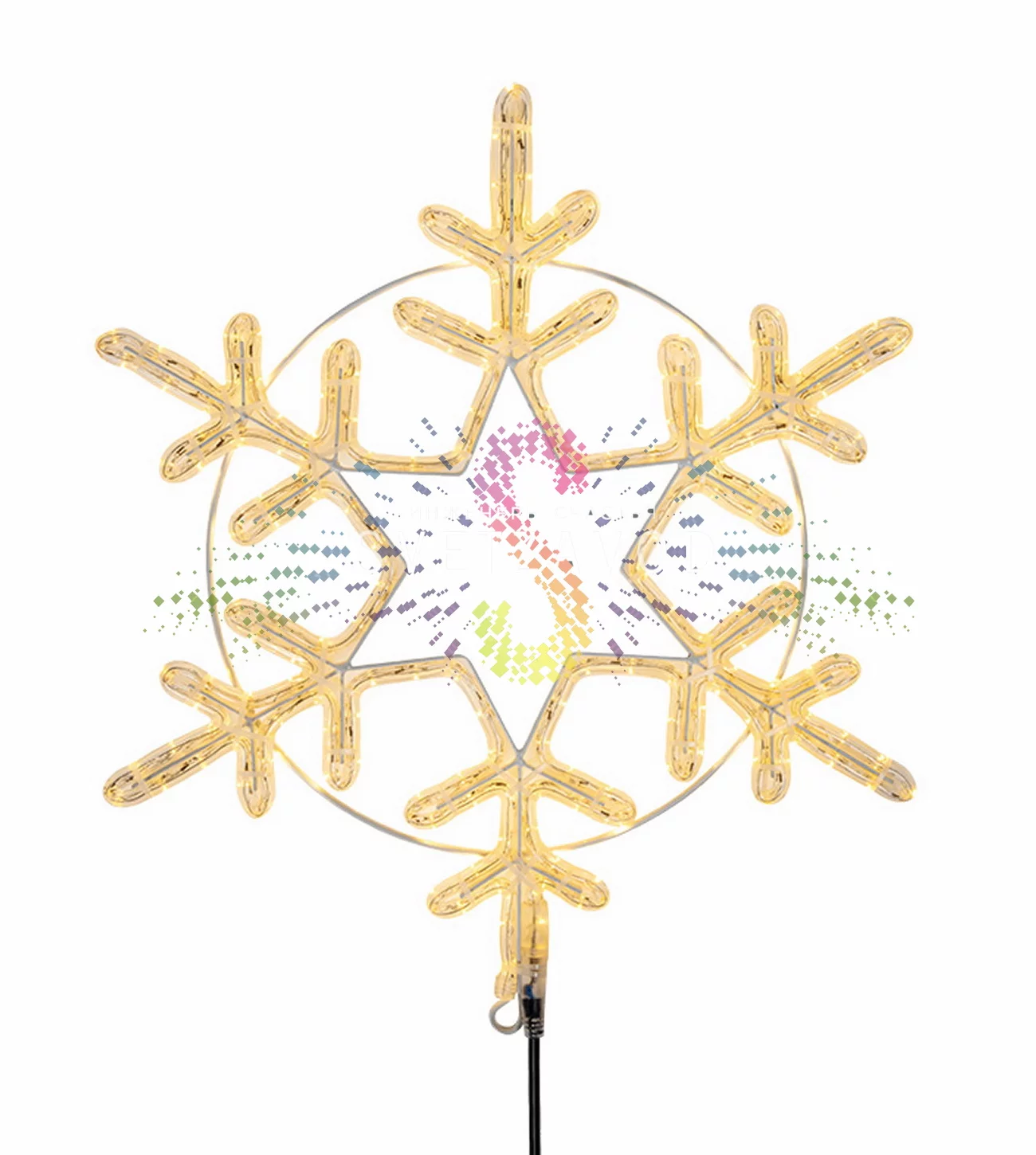 Прочный каркас и защита: Основа снежинки — металлический каркас с порошковой покраской, который обеспечивает жесткость формы и устойчивость к коррозии. Световой контур выполнен из прочного дюралайта, герметично закрепленного на каркасе. Класс защиты IP65 гарантирует полную защиту от пыли и струй воды, что позволяет использовать украшение в любую погоду.
