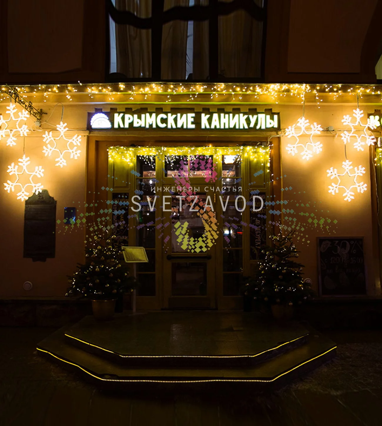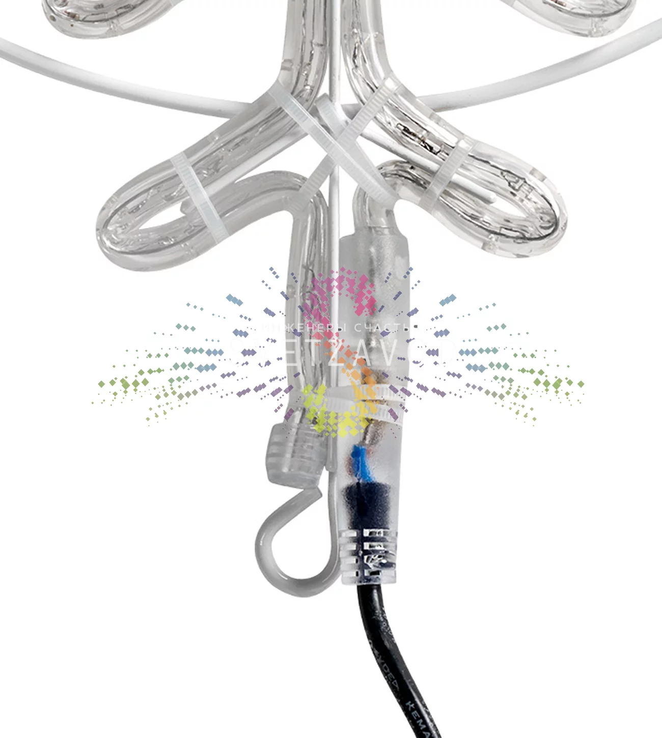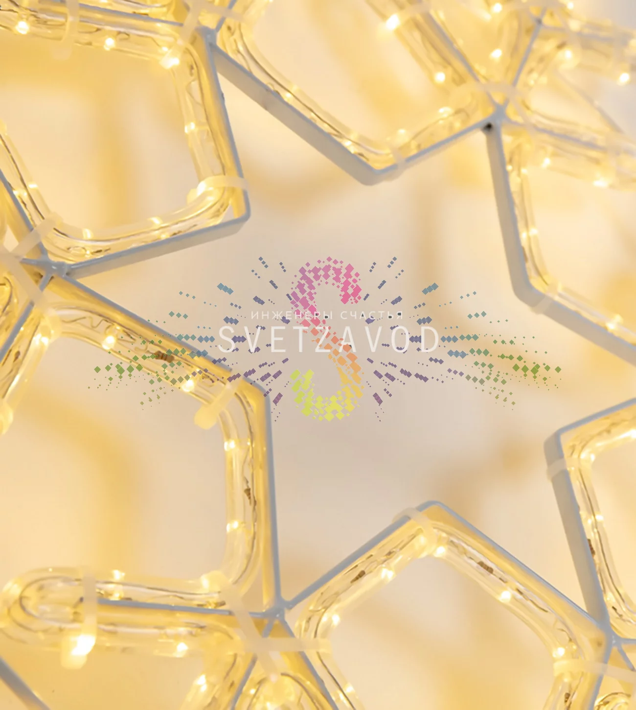 Прочный каркас и защита: Основа снежинки — металлический каркас с порошковой покраской, который обеспечивает жесткость формы и устойчивость к коррозии. Световой контур выполнен из прочного дюралайта, герметично закрепленного на каркасе. Класс защиты IP65 гарантирует полную защиту от пыли и струй воды, что позволяет использовать украшение в любую погоду.