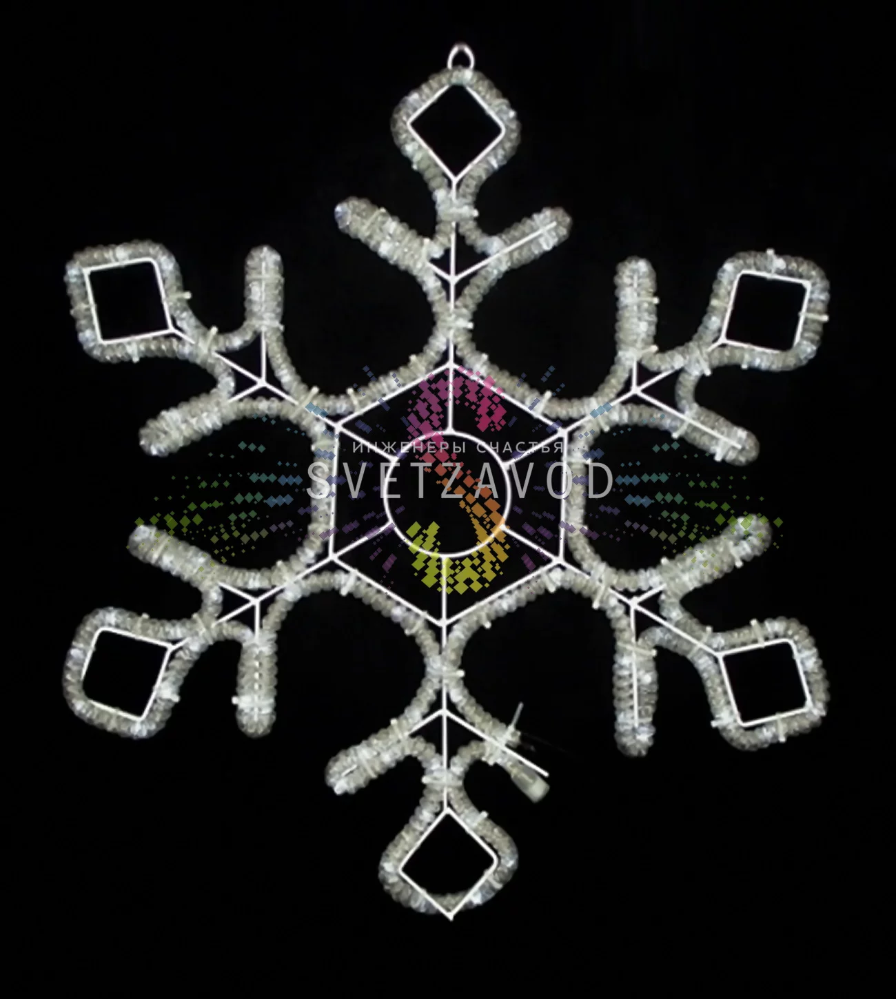 Устройство: Каркас из прочного металла с порошковым покрытием обвит светодиодным дюралайтом. Все электрические соединения герметизированы, что и обеспечивает высокую степень защиты IP65. Это гарантирует, что уличная снежинка с подсветкой будет работать в дождь, снег и мороз.