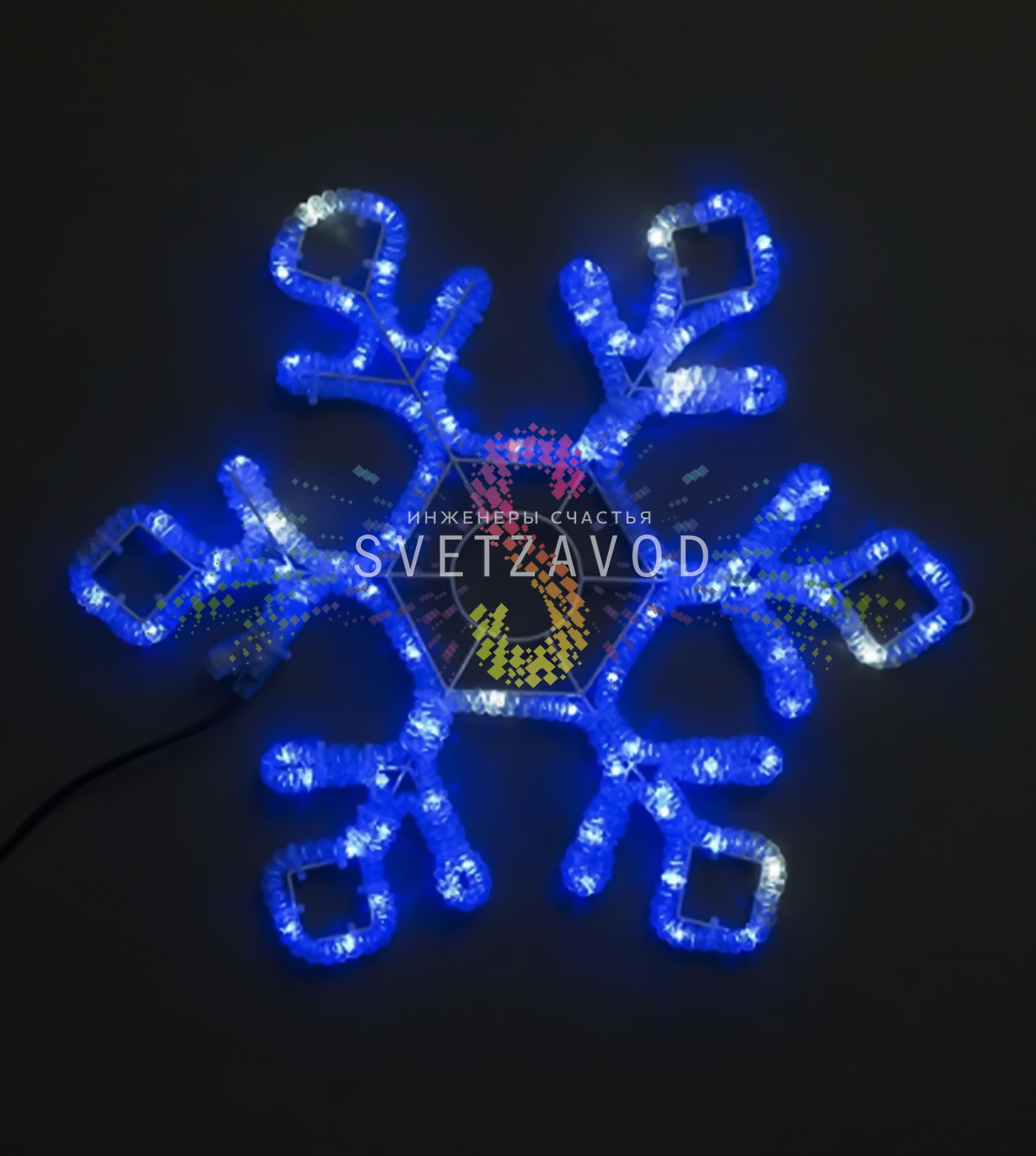 Светодиодная снежинка размером 60,5×52 см выполнена в насыщенном синем цвете с эффектом мерцания, что создает динамичную игру света.