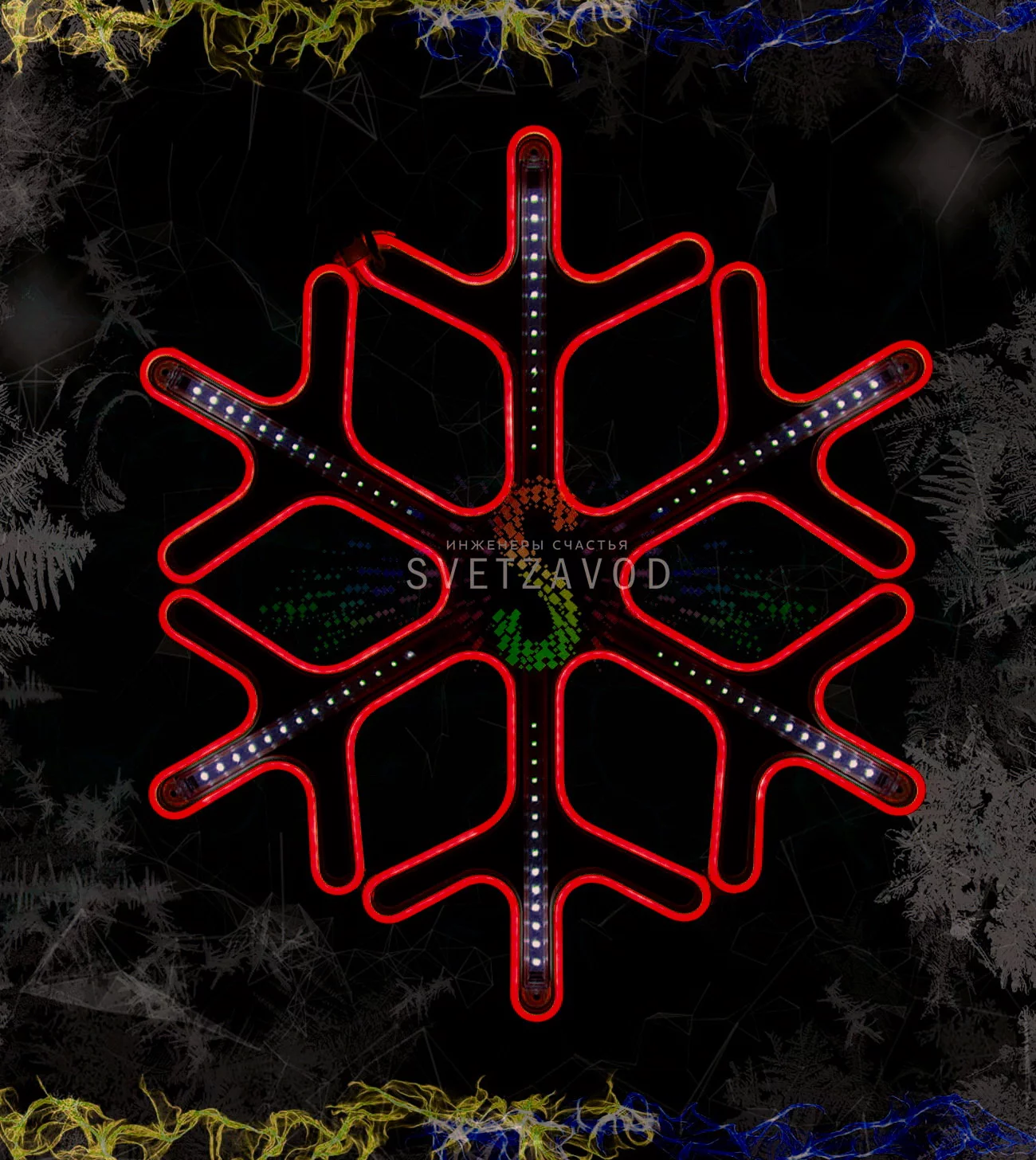 Яркая красная неоновая подсветка делает снежинку заметной даже в плотной городской иллюминации, что важно для привлечения внимания к вашему объекту.