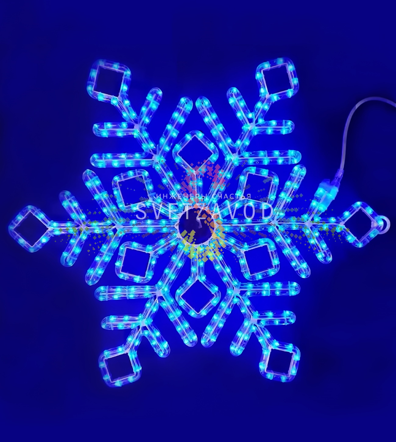 Снежинка работает от сети 220В и комплектуется кабелем питания с вилкой для простого подключения.