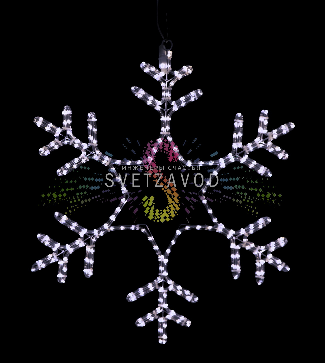 Светодиодная снежинка изготовлена на прочном металлическом каркасе с порошковой покраской, что гарантирует устойчивость к деформациям и коррозии. В качестве источника света используется современный светодиодный дюралат.