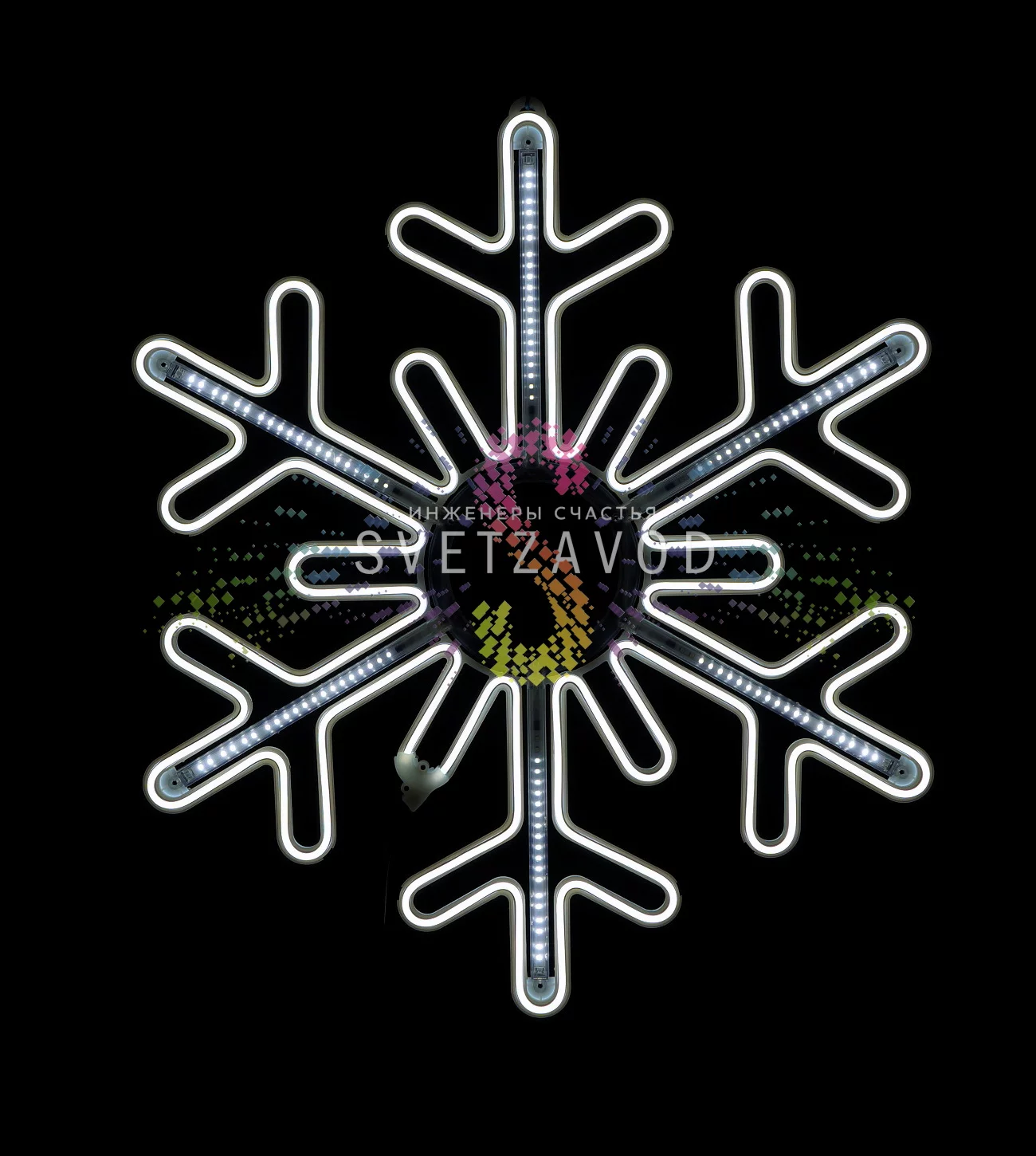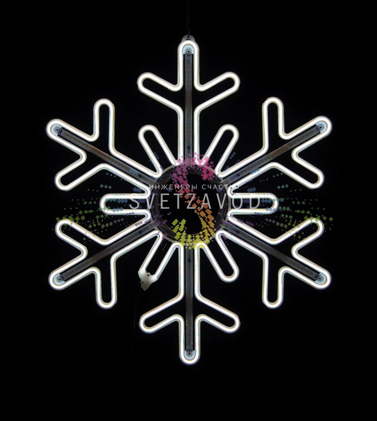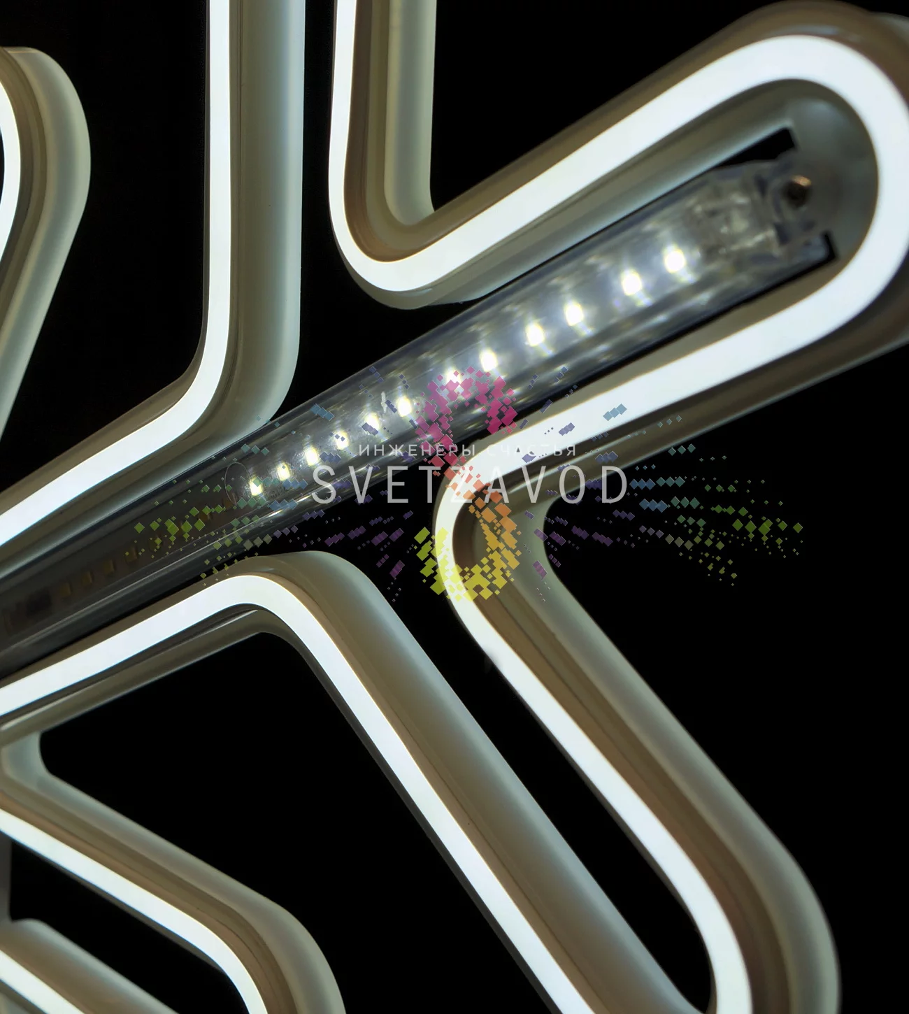 Устройство: Каркас снежинки изготовлен из прочного пластика, который не деформируется при перепадах температур от -30°C до +50°C. Световой контур выполнен из гибкого неона (дюралайта) с холодным белым свечением, надежно закрепленного на основе.