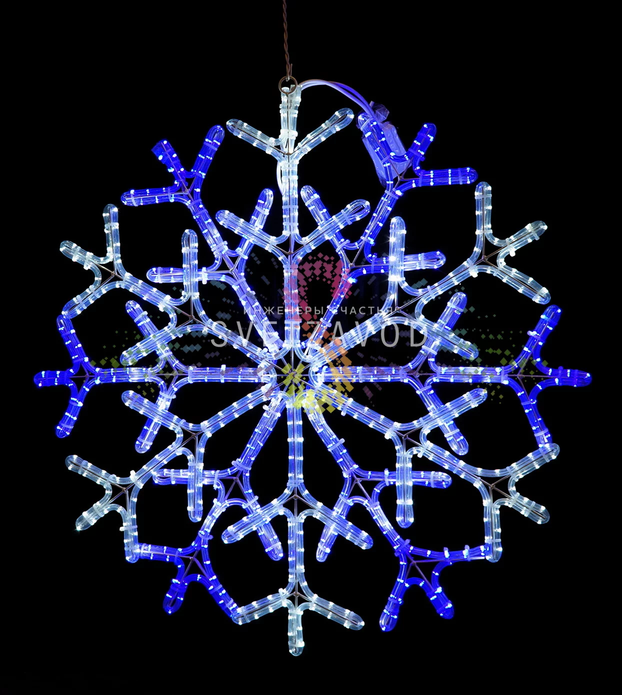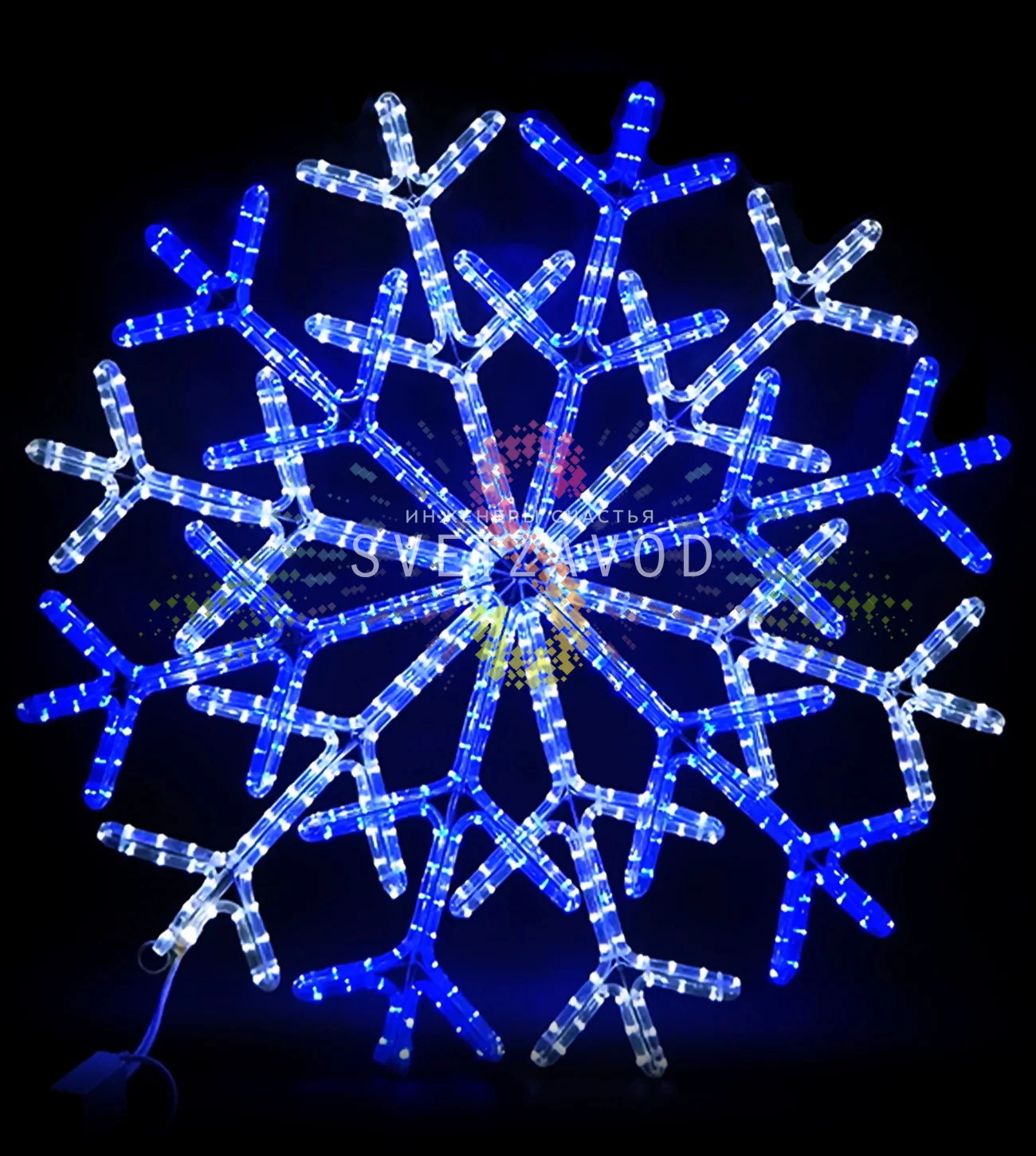 Снежинка диаметром 90 см с комбинацией синего и белого свечения создает динамичную игру света (эффект "чейзинг"), притягивая взгляды и создавая волшебную атмосферу.