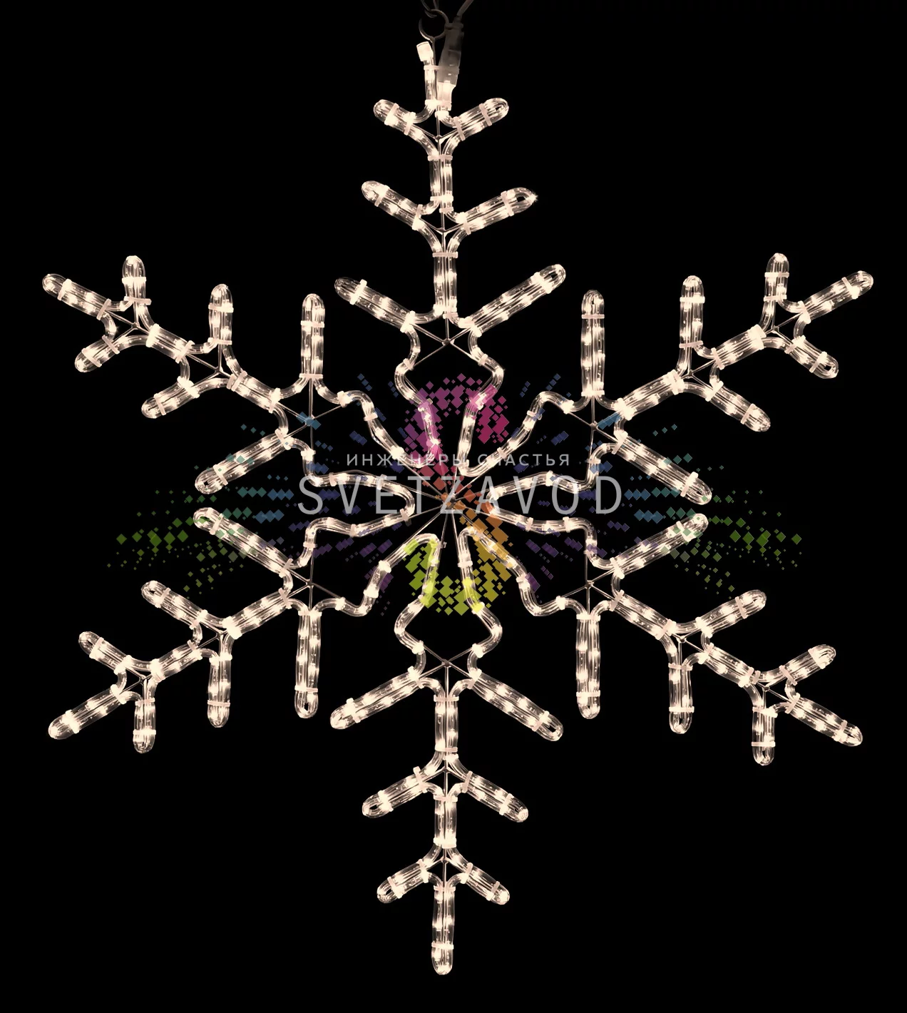 Основа долговечности: Каркас снежинки изготовлен из прочного металла с антикоррозийным покрытием. Световой контур выполнен из дюралайта — гибкого светодиодного шнура, который обеспечивает равномерное и яркое свечение без мерцания.