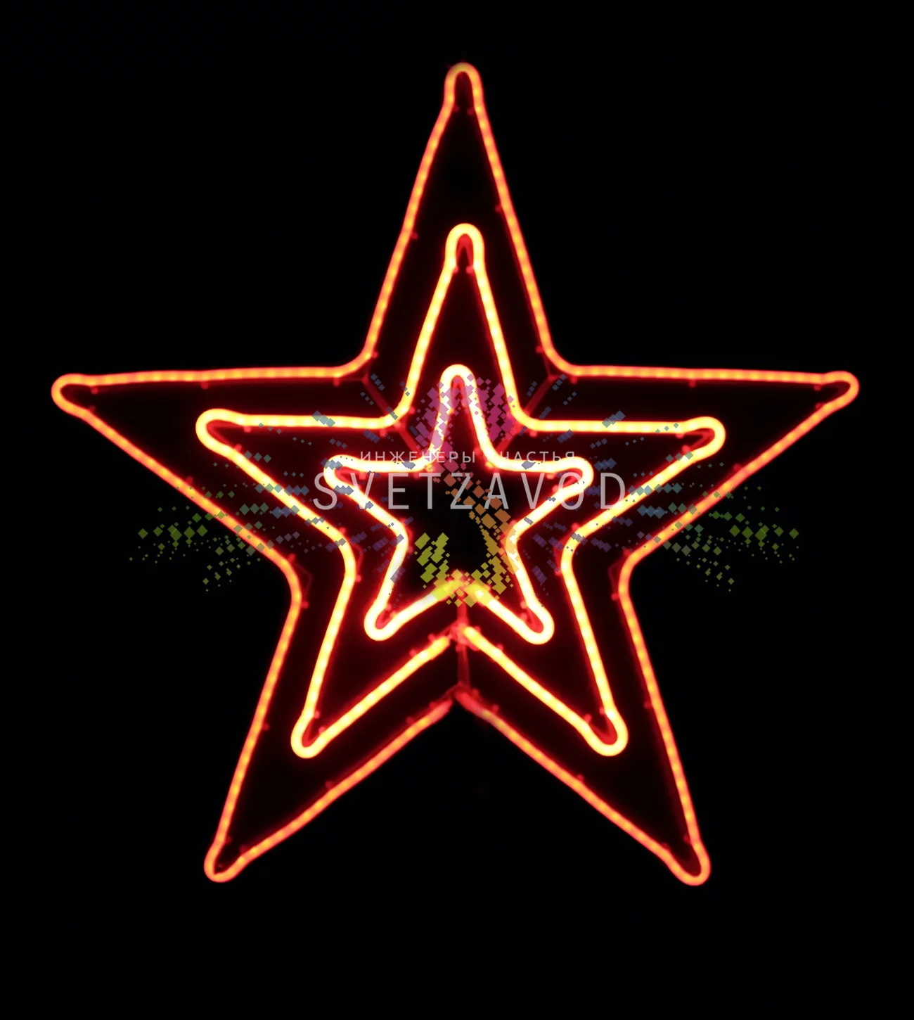 Световая фигура звезда 83 см – это фигура 2D, изготовлена на основе стального металлического каркаса с прочным полимерным покрытием устойчивым к УФ излучению, светодиодным неоном, закреплённым на каркасе с помощью профессиональных пластиковых хомутов, работает в режиме чейзинг. Данная фигура является низковольтной -12В, блок питания с понижающим трансформатором в комплекте.
