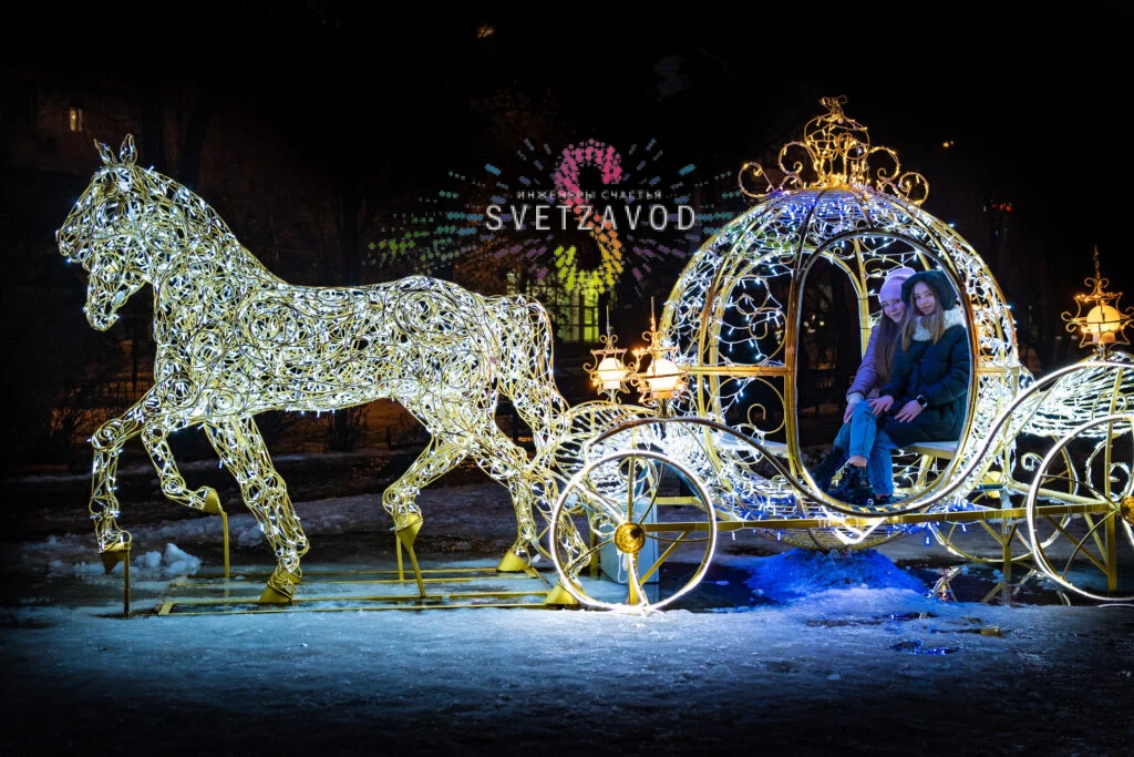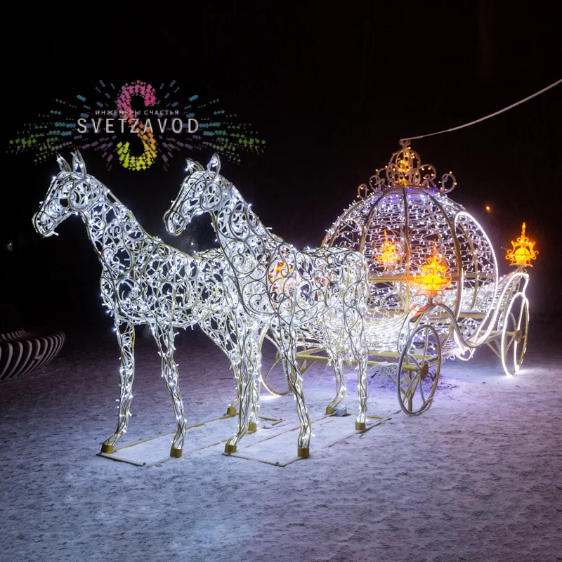 Решение для премиального оформления: Когда требуется создать незабываемую атмосферу и подчеркнуть статус мероприятия или объекта, стандартные украшения не подходят. Светодиодная фигура "Карета с лошадьми" — это готовое решение для тех, кто ищет эффектные уличные световые фигуры премиум-класса. Ее внушительные габариты (7.5 на 3 метра) и детализированная объемная форма делают ее центральным элементом любой композиции, притягивающим восхищенные взгляды. В нашем интернет-магазине световых фигур 3D вы можете купить светодиодные фигуры такого уровня, которые преображают пространство.