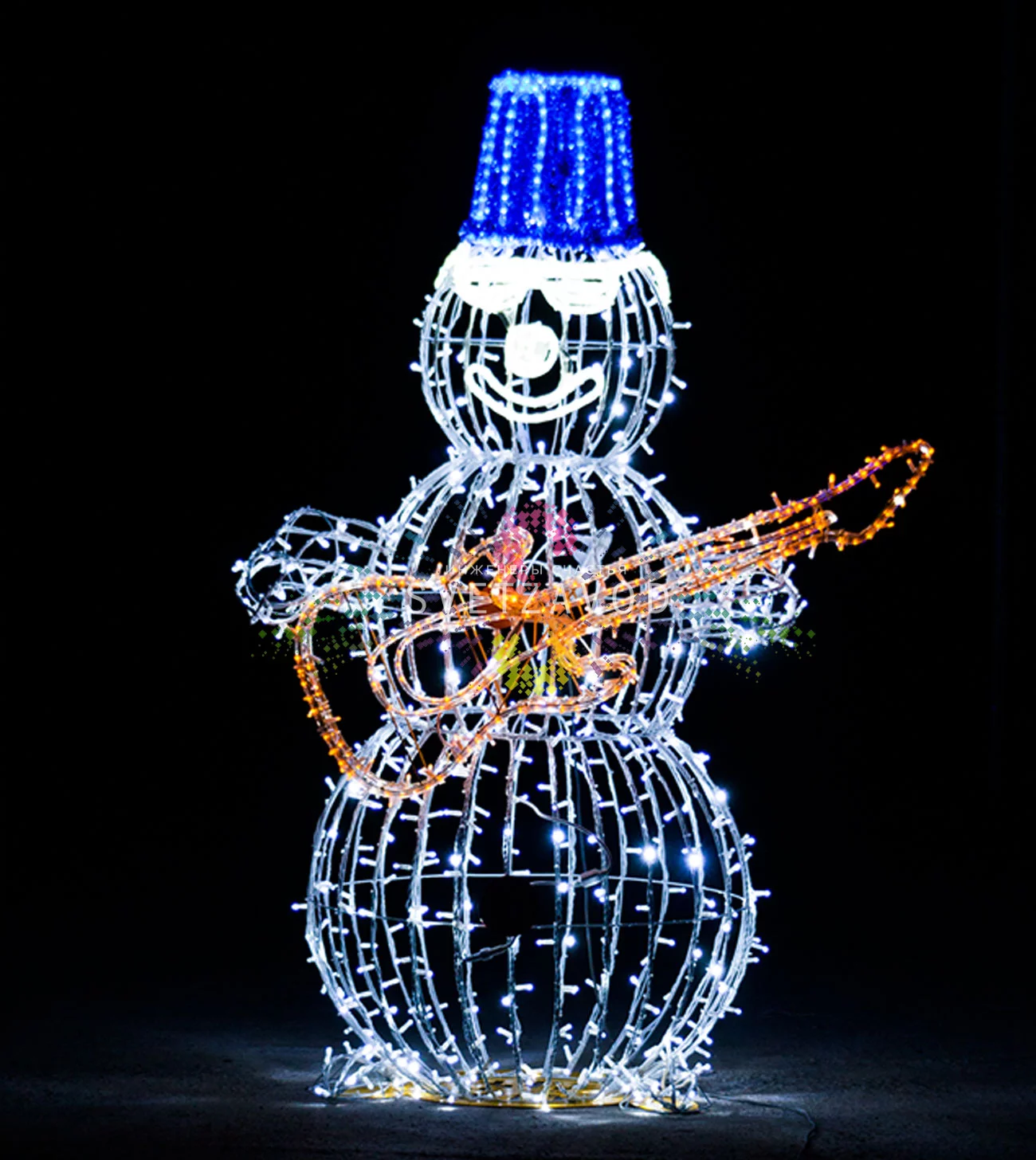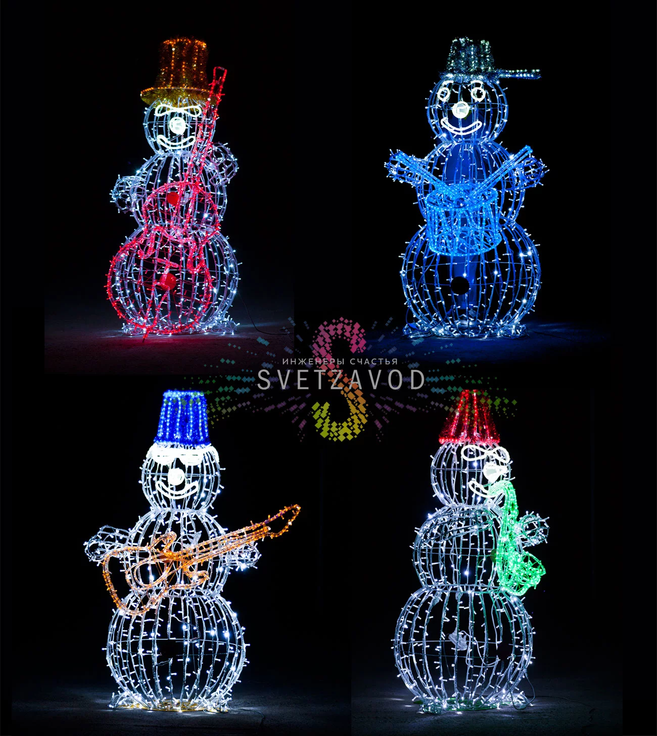 Центр новогоднего декора: Композиция "Снеговики-музыканты" — это готовое решение для яркого и стильного оформления. Четыре светящихся снеговика с музыкальными инструментами (барабан, саксофон, контрабас, гитара) образуют целый оркестр, который станет главным украшением вашего участка, входной группы или зоны отдыха. Это отличный способ купить светодиодные фигуры для создания волшебной сказки у дома.