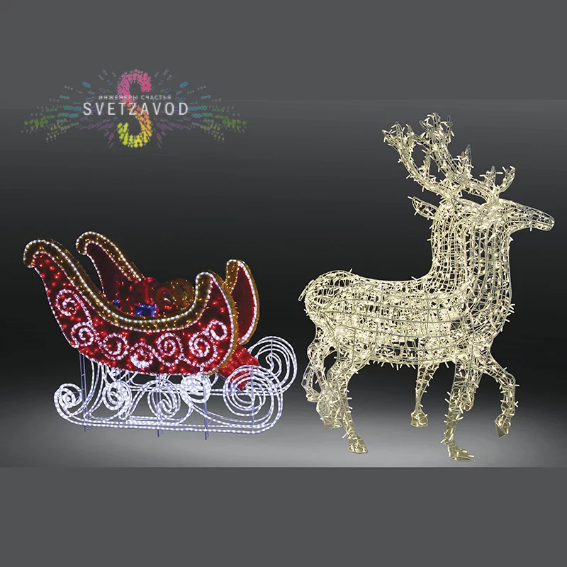 Композиция состоит из шести независимых элементов, что упрощает логистику и монтаж: сани (200x80 см), два оленя (120х195 см каждый) и три подарка (40х40 см каждый). Световой контур выполнен из надежного дюралайта, который не боится мороза и осадков.