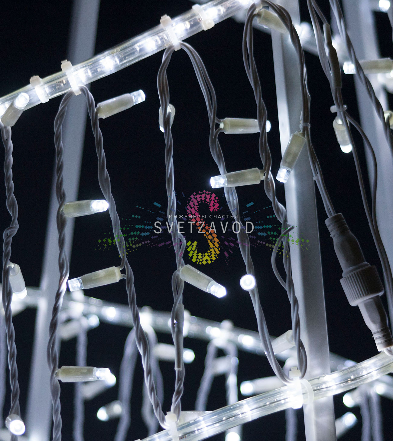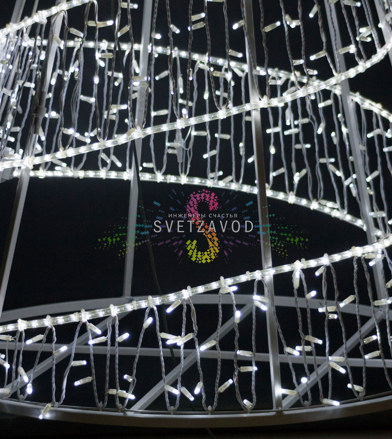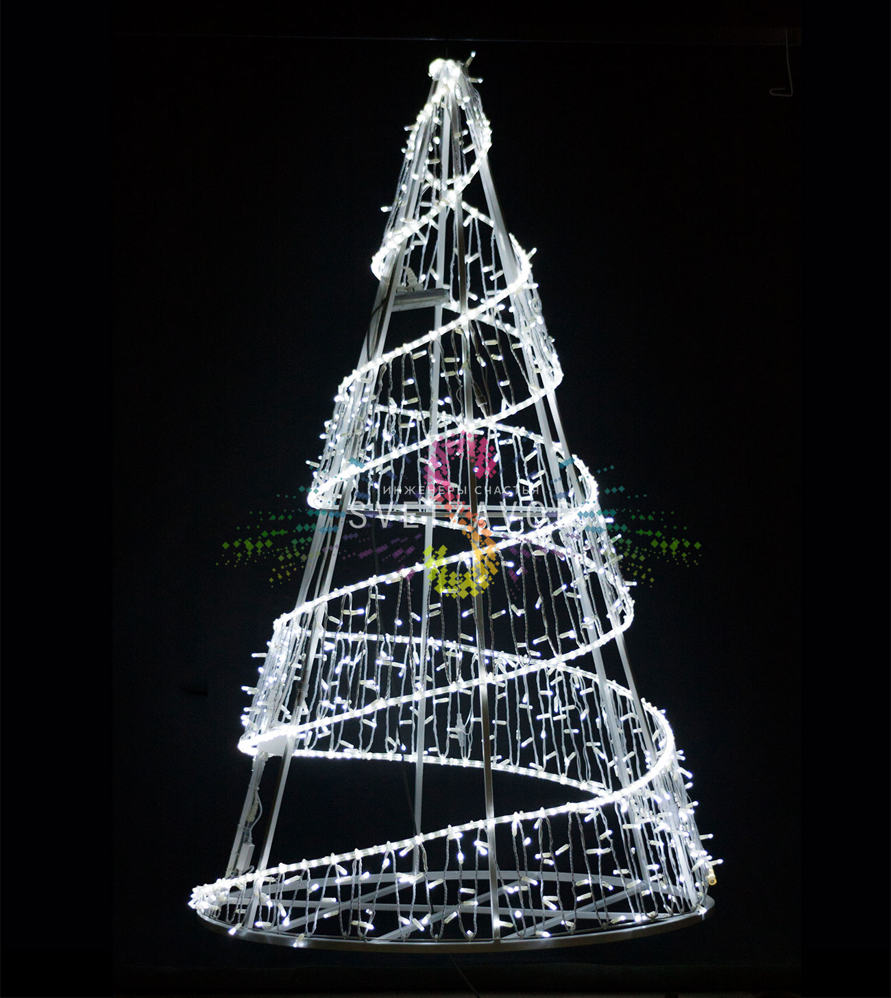 Светодиодная конструкция в форме ёлки "Конус" высотой 2000 мм, диаметр 1200 мм, монолитная, каркас - сталь, сварной, не разборный. Металлический каркас ели состоит из облегчённого холоднодеформированного квадратного профиля, полосы и проволоки. Окрашен каркас ёлки на линии порошковой покраски в белый цвет.