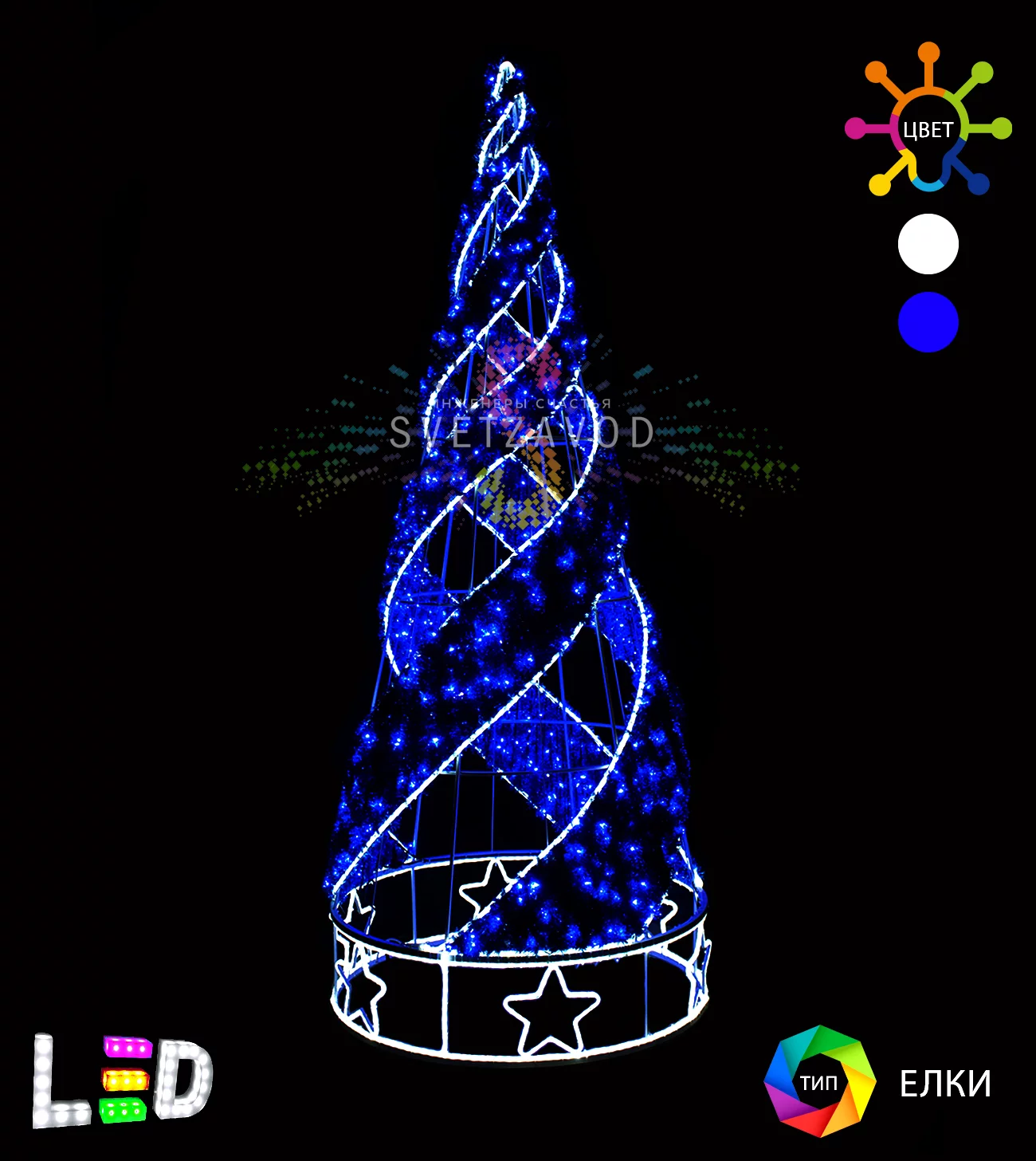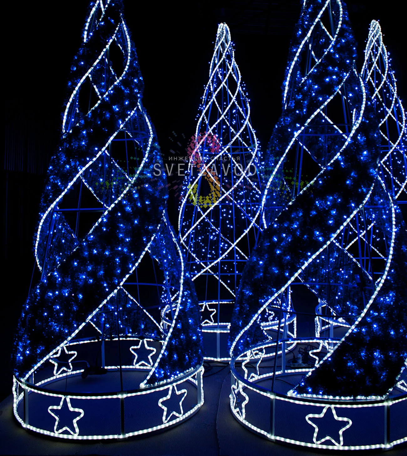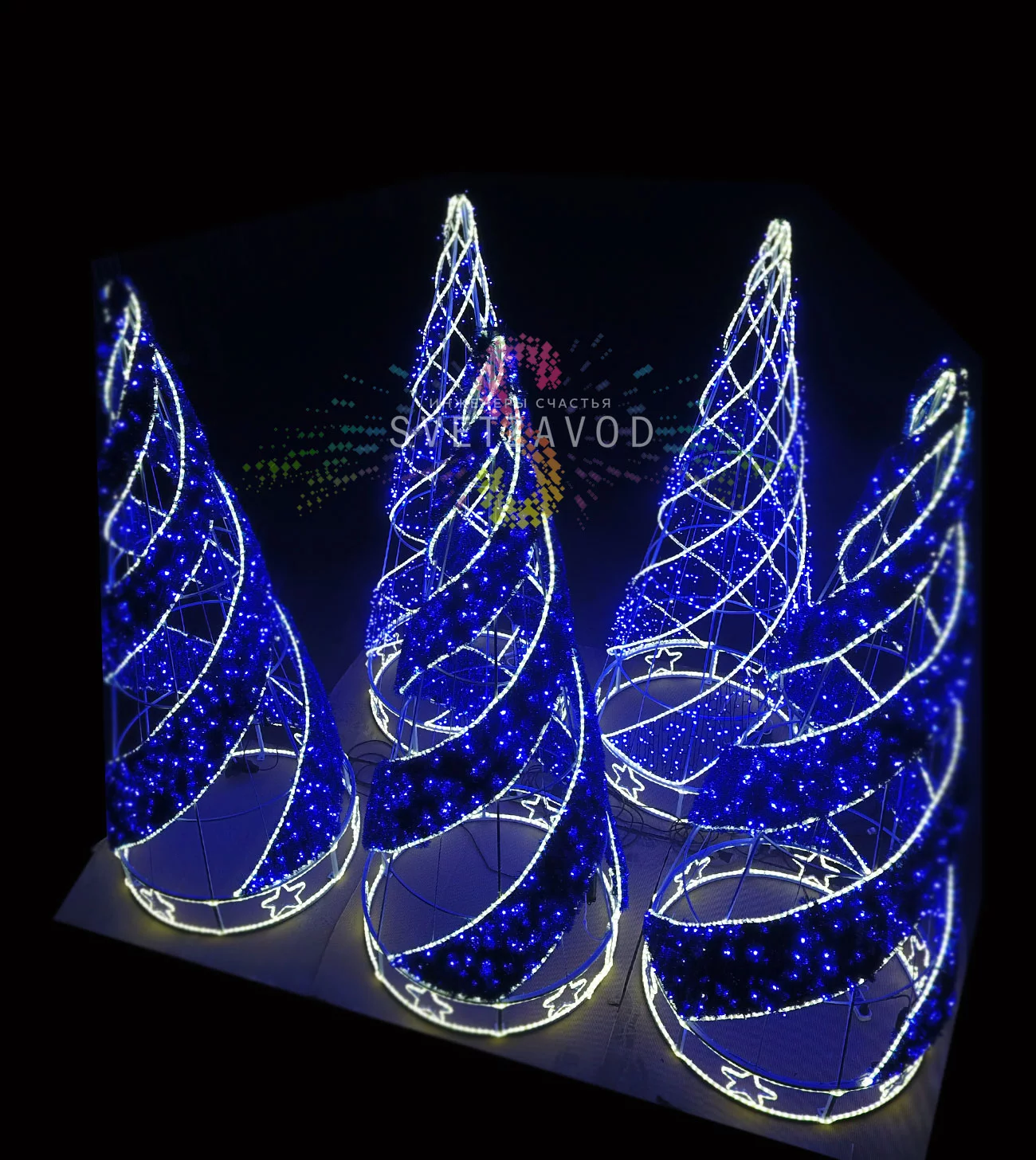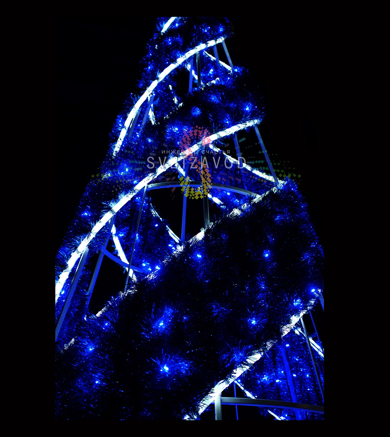 Основа фигуры — прочный каркас из стального профиля, покрытый белой порошковой краской. Он не гнется под снегом и ветром, сохраняя идеальную форму конуса. Гирлянда выполнена из влагозащищенного дюралайта с низковольтным питанием 24В, что повышает безопасность.