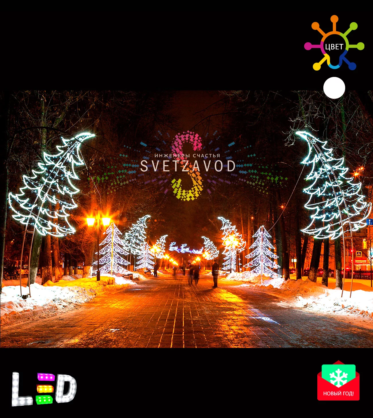 Прочность: Каркас ёлки изготовлен из стали с защитным полимерным покрытием. Это гарантирует устойчивость к ветровым нагрузкам, коррозии и механическим воздействиям, что критически важно для уличных световых фигур.