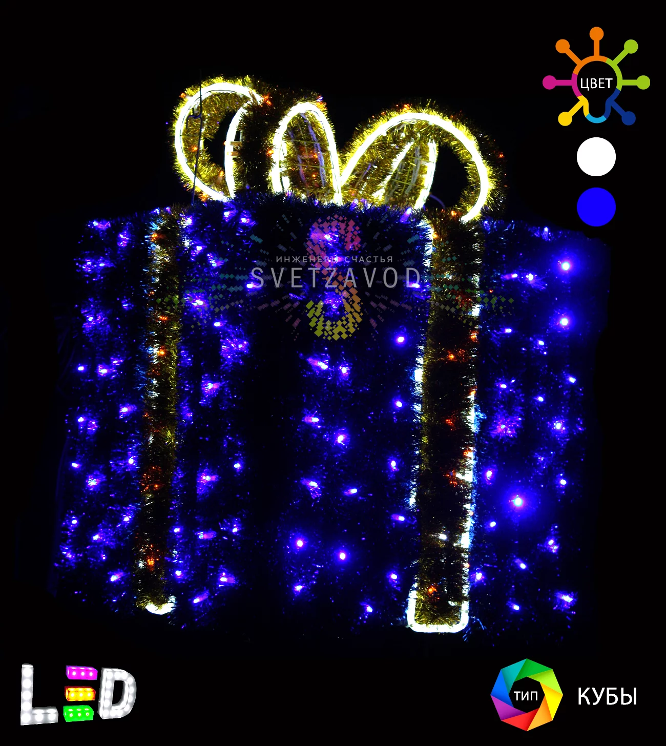 Решение: Объемная световая фигура «Подарок» — это готовый акцент для вашего сада, фасада дома или коммерческого объекта. Синий куб с контрастным желтым бантом создает мгновенный праздничный антураж, видимый издалека. Это идеальный выбор для тех, кто хочет купить световые фигуры 3D для создания профессионального новогоднего декора. Прочная конструкция и защита IP65 делают ее надежным уличным световым украшением, готовым служить вам сезон за сезоном.