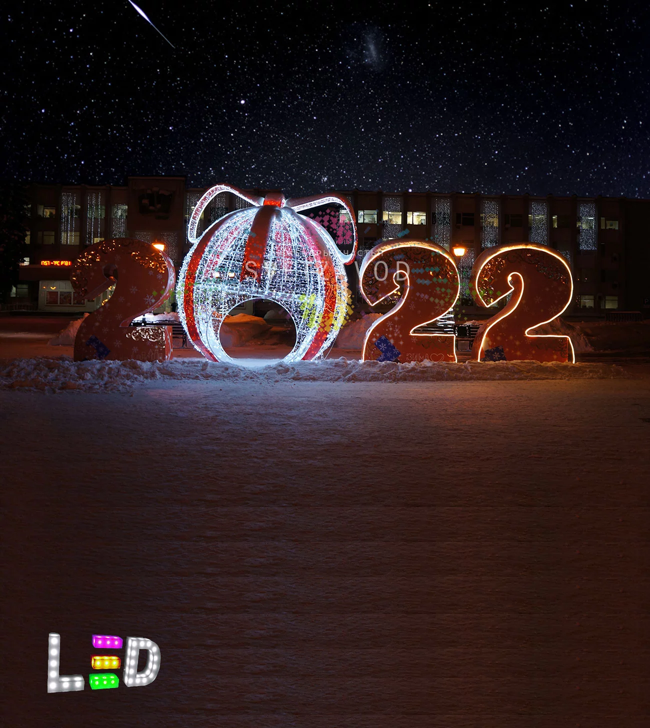 Надежность в деталях: Эта световая фигура 3D спроектирована для интенсивной уличной эксплуатации. В основе — прочный стальной каркас с защитным покрытием, который обеспечивает устойчивость к ветровым нагрузкам и коррозии. Световой контур формируется 20 000 ярких светодиодов, закрепленных на надежных влагозащищенных гирляндах.